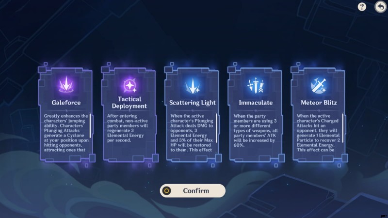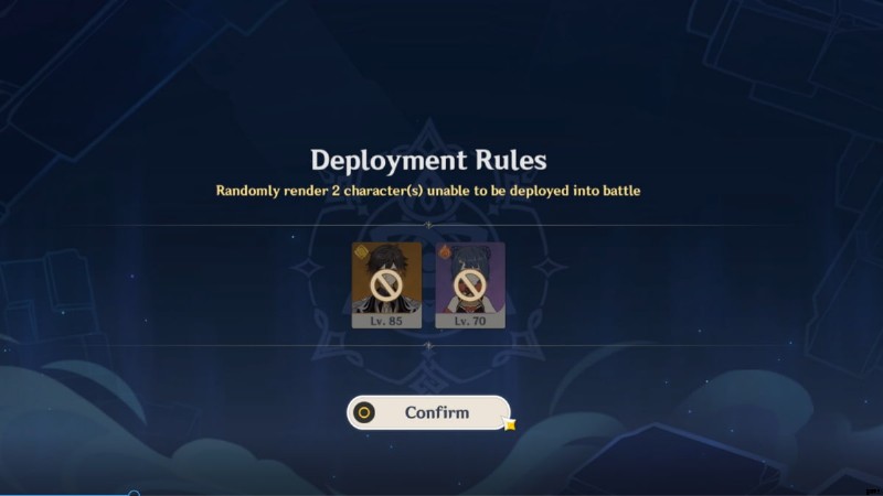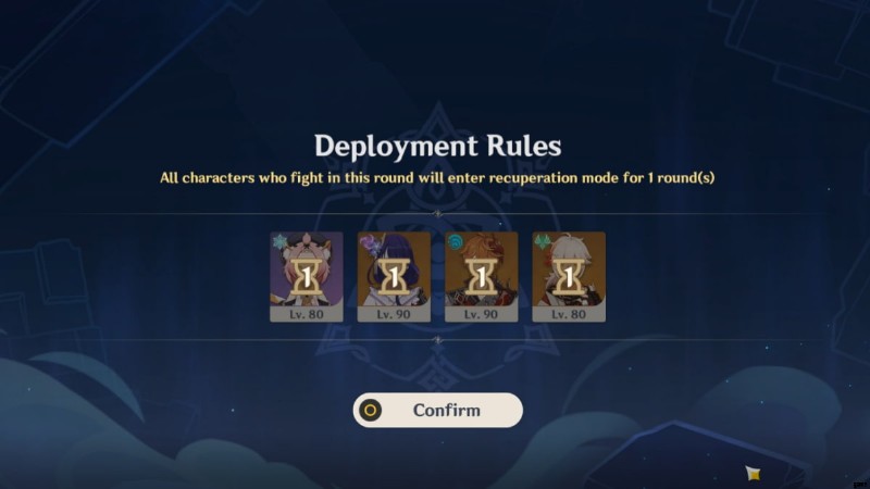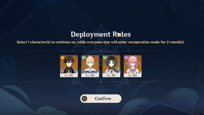Adeptus Bridges を使用して Direcliff Court を移動できます .配置ルールでは、戦闘の最初の 3 ラウンドをクリアするのに役立つ開始パーティと戦略を選択できます。各ステージは 9 つの戦闘で構成されますが、1 人のキャラクターを保持する必要があります 3戦ごと。基本的に、ローテーションは次のようになります: