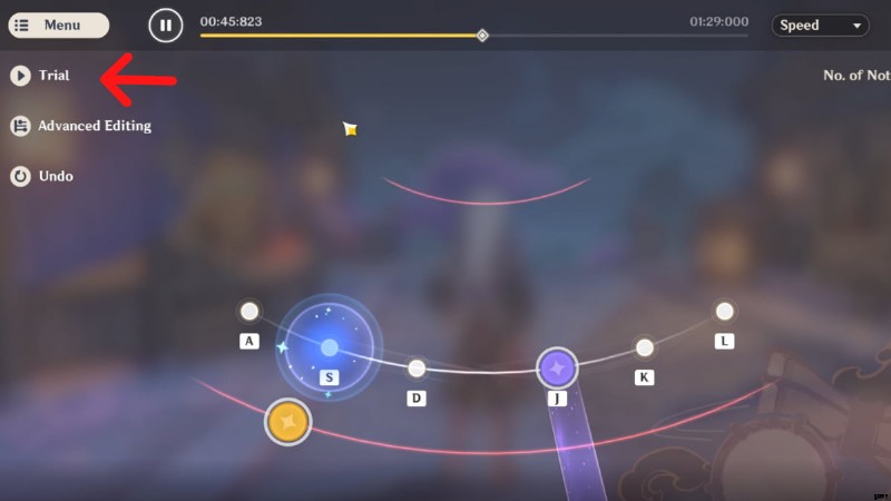 トライアルをクリックします 画面の左上にあるボタンをクリックして、ビートマップの再生を開始します。これを行うと、プレイヤーが作品をどのように体験するかを評価するのに役立ちます。進行中でもビートマップをテストできますが、配置したノートのみが表示されます。