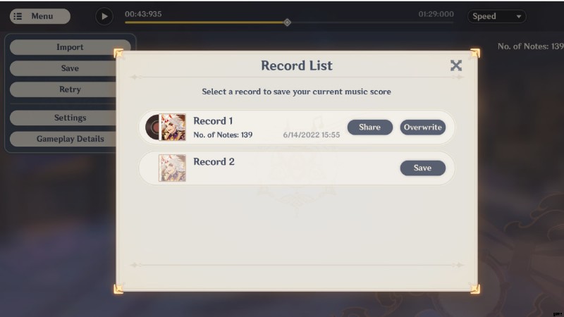 その間、カスタム ビートマップを他のユーザーと共有できます。 [保存] ドロップダウンからレコード リストに移動し、[共有] をクリックします。 . Genshin Impact は 共有コード を生成します 他の人があなたの作品を再生するために使用できます。ただし、Discantus に到達する必要があります (難易度問わず)イベントソングでシェアコードを入手。