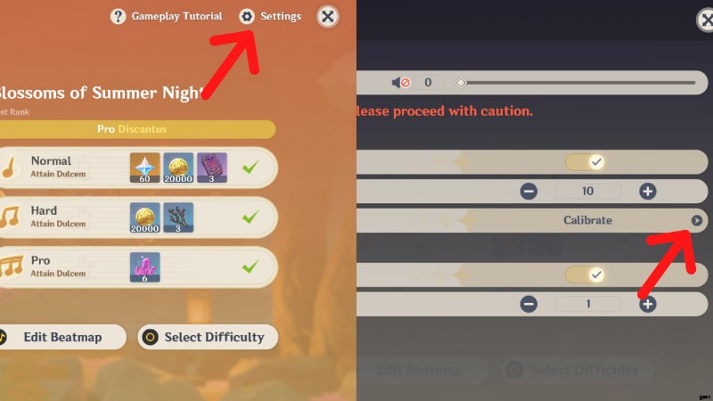 設定に移動します ビートマップ選択画面右上のメニュー。 [ラグ キャリブレーション] で、[キャリブレーション] の横にある矢印 をクリックします。 対応するメニューを開きます。
