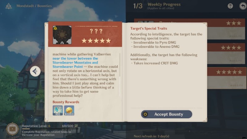 星 5 のバウンティは、敵がエレメンタル ダメージや物理ダメージの影響を受けない特別な特性を持っている可能性があるため、やや難易度が高くなります。しかし実際には、目立った難易度の差はありません 星 3 と星 5 のバウンティの間にあるため、より多くの EXP を獲得できる星 5 のオプションを選択することをお勧めします。報奨金を受け取る前に、対象の敵の特殊な特性と弱点を確認してください それを倒すためにどのキャラクターを連れてくる必要があるかを理解するために。