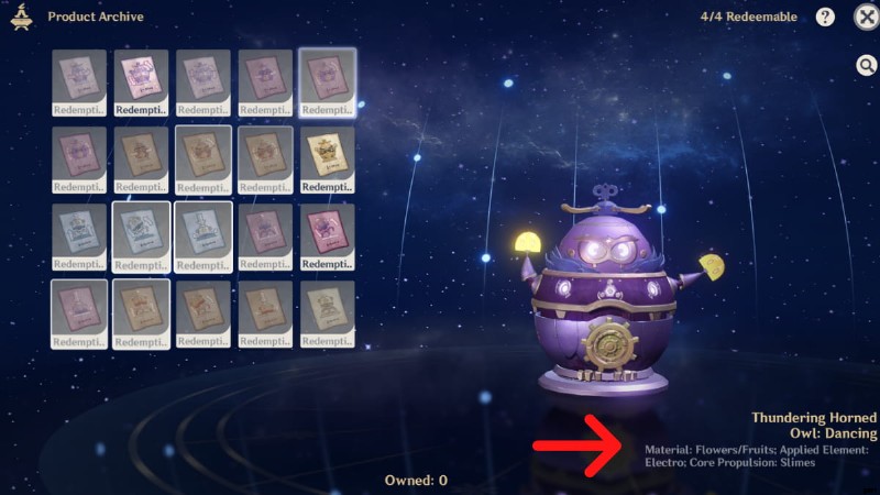 製品アーカイブに移動 イベント メニューのセクションを選択すると、作成可能なすべてのおもちゃのモデルと、画面の右下にそれぞれのレシピが表示されます。提供されたレシピに従うことで、ほとんどの場合、指定されたモデルを取得できます。唯一の例外は、使用するレシピに関係なく、2 つの特別なモデル (Traveling Horned Owl と Traveling Triped) をわずかな確率で入手できることです。