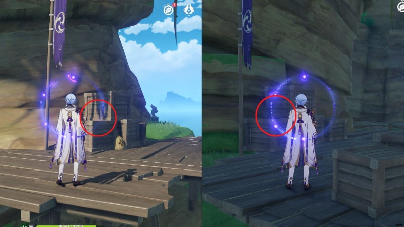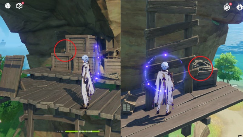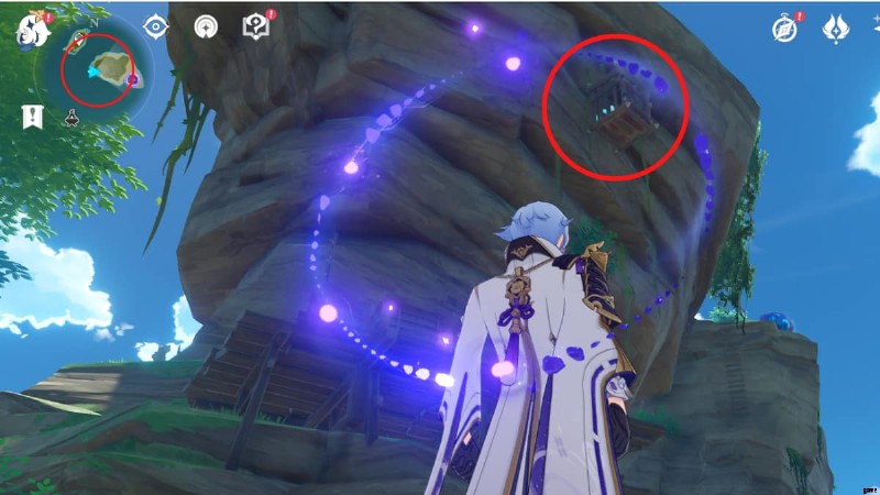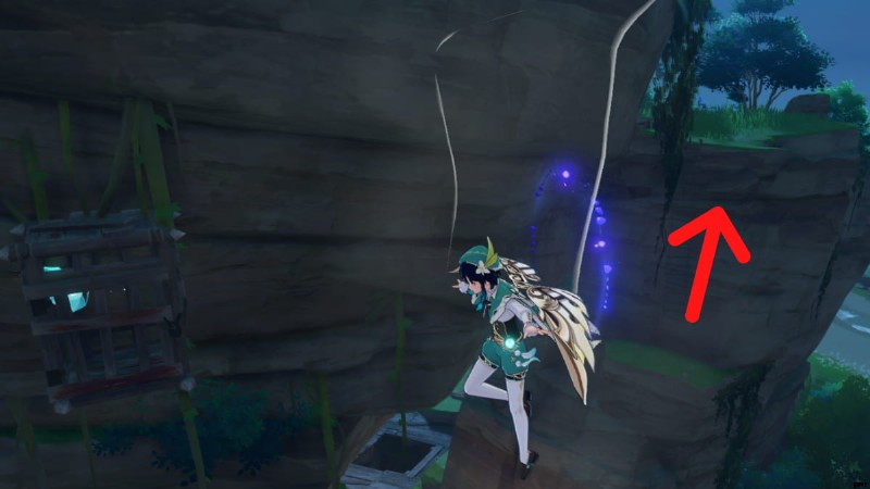 シーリーはかなり高い位置にあり、Venti's Burst を使用しても到達するのは困難です。シーリーに到達するには、上の画像で矢印が指している崖の側面にあるロープのはしごを登り、反対側の上部から滑り降りてケージとやり取りしてロックを解除し、シーリーに到達します.シーリーがあなたを下に追いかけるには、シーリーと接触する必要があることを忘れないでください。
