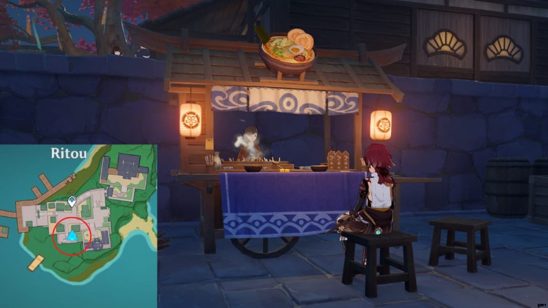 唯一の真実はカツサンドのレシピを使って作成できます 、リョウコの屋台で購入できます リトウで 2,500 モラ。 1回の購入で、カツサンドとその派生品を好きなだけ作ることができます。彼女の屋台の正確な位置は、下の画像で丸で囲まれています.