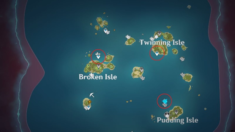 ゴールデン アップル アーキペラゴ ワールド マップを照らすには、3 つのテレポート ウェイポイントのロックを解除する必要があります 上の画像の丸で囲んだもの。ブロークン アイルの北にあるテレポート ウェイポイントはブロークン アイルとミナシャス アイルのロックを解除し、ツイニング アイルとプディング アイルのウェイポイントは対応する島のロックを解除します。