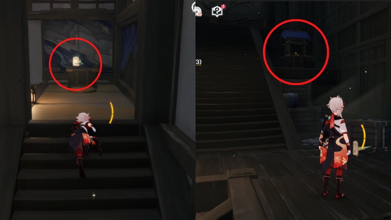 - Once you've picked up the second Melodic Omamori, turn left and climb the stairs. Then look to the right to find the second Shrine . Place the Omamori in it.