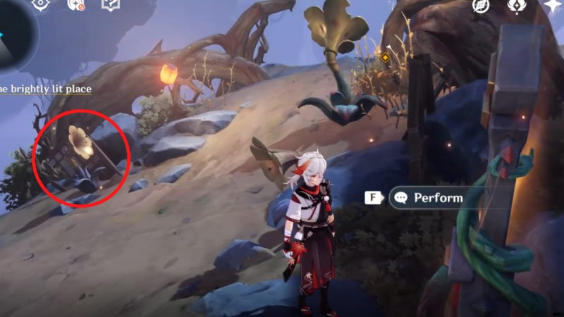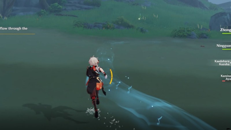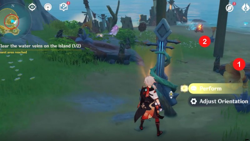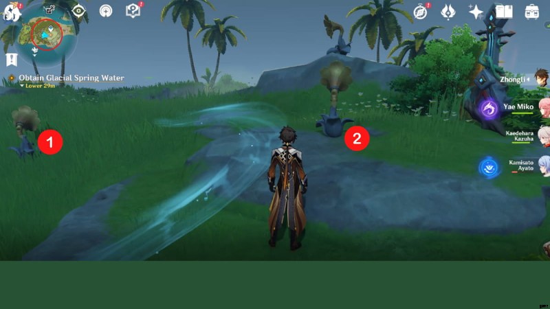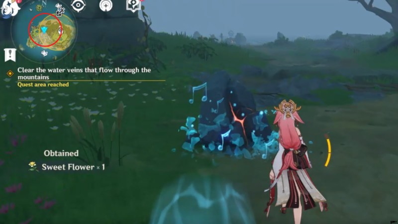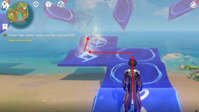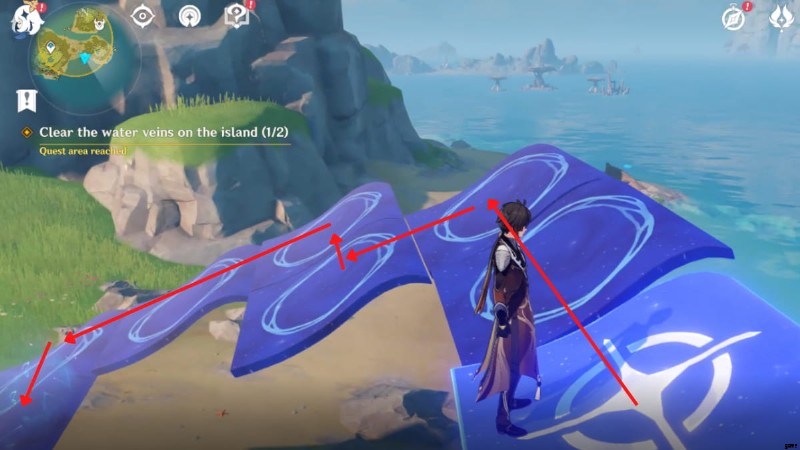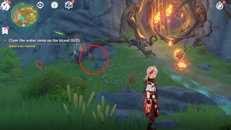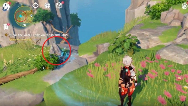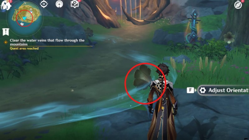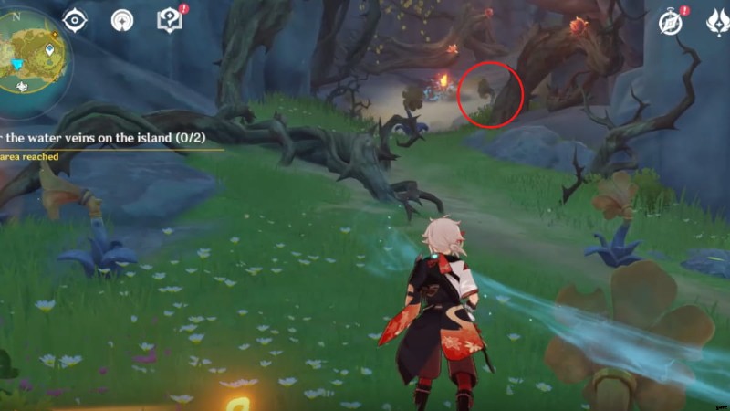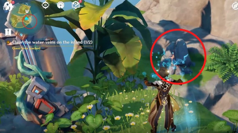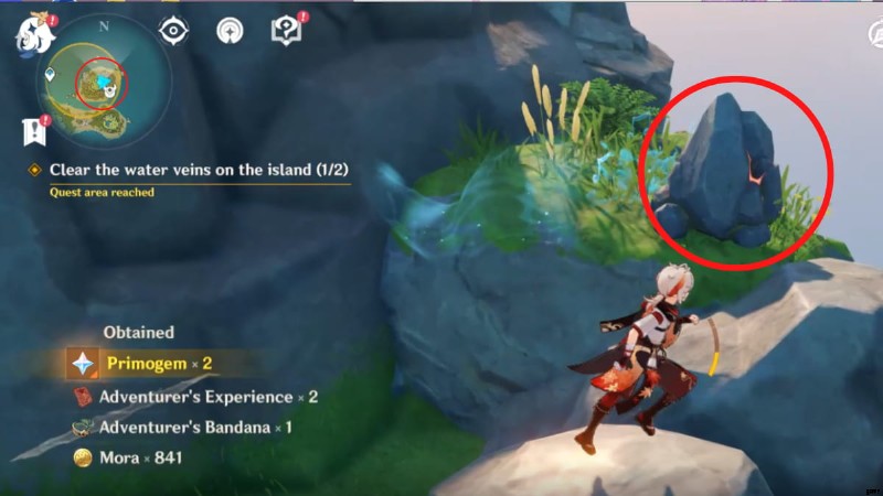 - 上の画像で丸で囲まれたエリアに向かい、水脈を見つけます。 ブレイク 強攻撃またはエレメンタルスキルでそれを。