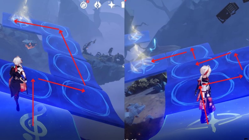 - 上記のパスに従って、Melodic Petals の 3 番目のバッチを完成させます。上の最後の花びらを踏むとすぐにカットシーンが再生されるため、右上の残りの花びらは無視できます。