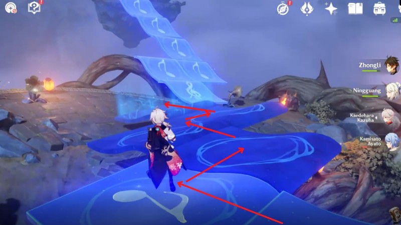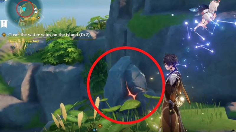 - 上の画像で丸で囲まれた場所に向かい、強攻撃 (ジオ ダメージ、クレイモア) またはエレメンタル スキルを使用して水脈を破壊します。