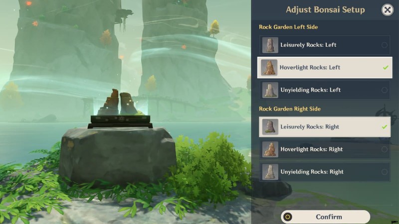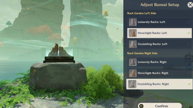 この配置により、エレクトロ モニュメントとアネモ モニュメントの両方のパズルを解くことができます。岩を選択したら、[確認] をクリックします .