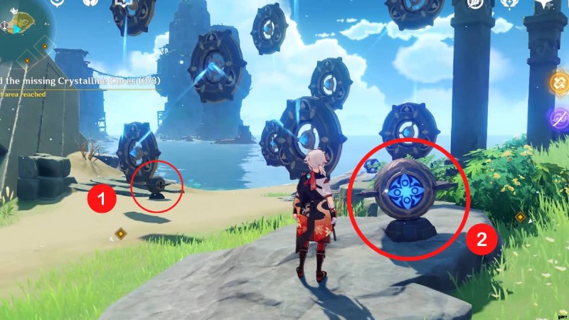壊れた島の右側にある、上の画像でマークされた 2 番目の場所に向かいます。この島には、ファトゥイのテントの横、洞窟のような大きな岩の前、風車のような構造物の前の 3 つのメカニズムがあります。