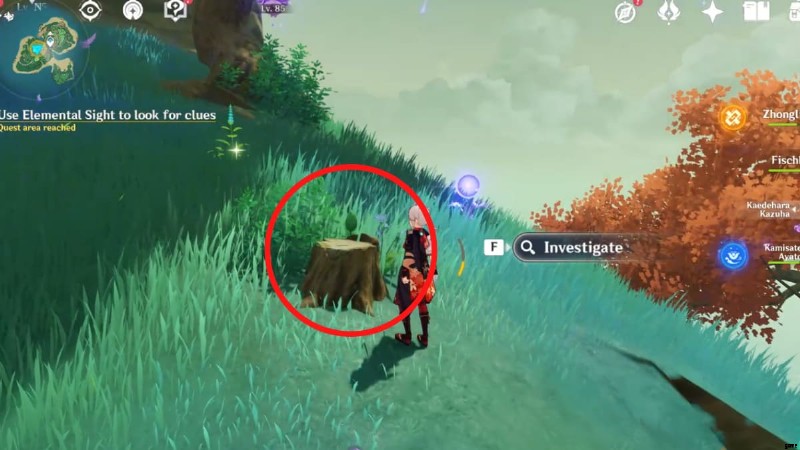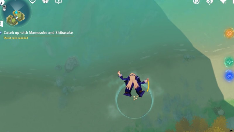 Elemental Sight を使用して手がかりを探すよう求められます。まめすけの後ろの山に登って調査するだけです 疑わしいログ。それが終わったら、滑空して戻ってまめすけに話しかけ、発見を報告してください。