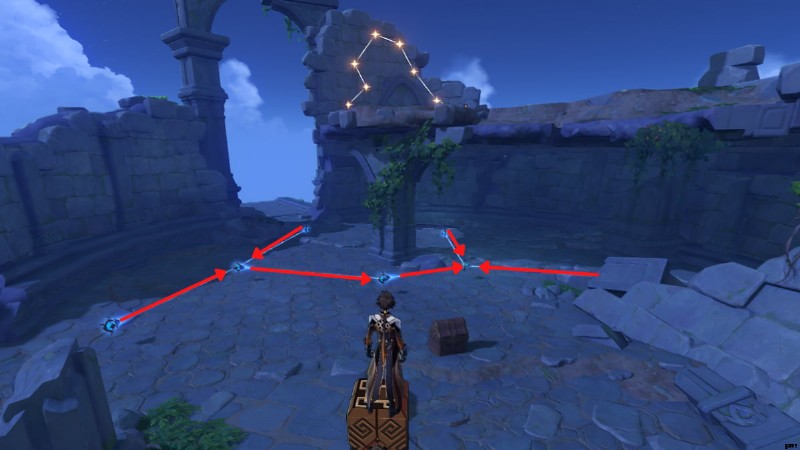 正確な については上の画像を参照してください 各スターガイドが向くべき方向。各スターガイドと対話して正しい方向を向くまで回転させてから、通常攻撃を使用して青い線をトリガーし、スターガイドを別のスターガイドに接続します.スター ガイドが間違った方向を向いている場合でも青い線が形成されることに注意してください。ただし、上記の回転だけがパズルを解決します。