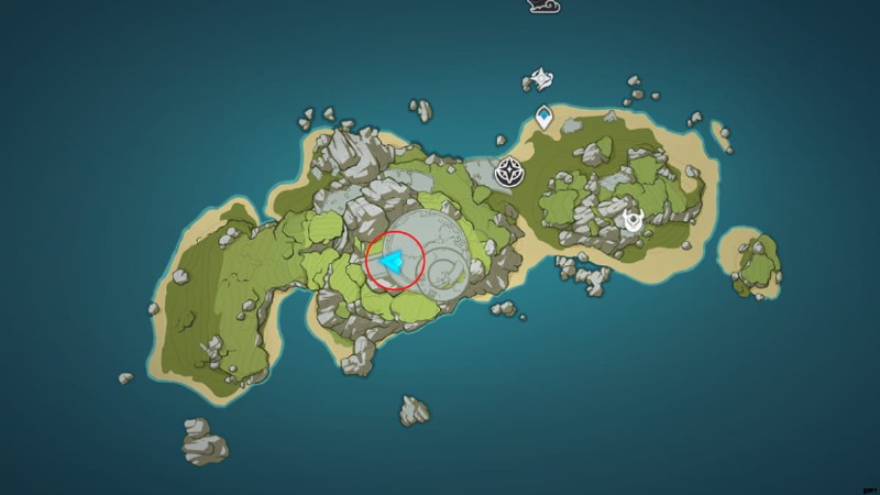 過去のバージョンには、そのようなパズルが 1 つあります。 The Ancient Azure Stars のクエスト セグメントを完了するとロックが解除されます。その後、Place in Water 機能を使用して、島の過去と現在のバージョンを切り替えることができます。すべての設定が完了したら、下の画像で丸で囲まれたエリアに向かい、パズルを見つけます。