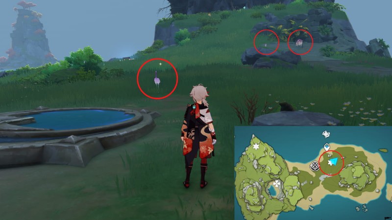 極上の宝箱のロックを解除するには、まず島の天気を変える必要があります。上の画像で丸で囲まれた領域に向かい、Cryo を Cryo Monument に塗布します。 霧の多い天候を作り出す .これにより、エリア内のすべての風の流れがなくなりますが、ドリーム フォームと呼ばれる紫色の動物が出現します。 .