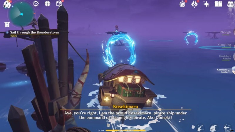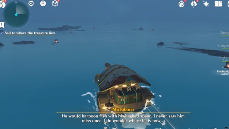 古関丸を使って障害物コースをくぐります。 Hilichurls を倒す必要はありませんが、道を塞いでいる建造物を攻撃する必要がある場合があります。障害物コースの島の端に停泊し、外に飛び出します Waveriderの、そして岩を踏んで続行します。巨大な山に登ってカットシーンを促し、持ち上げる 小さな浮き船。それが終わったら、グライドして古関丸と会話を試み、ワールド クエストを終了します。