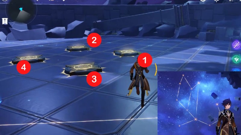 プレッシャー プレート パズルを解くための目標は、地面の参照画像に基づいて星座を形成することです。空の星は、参照用に上に番号が付けられている感圧板を踏むと動きます。