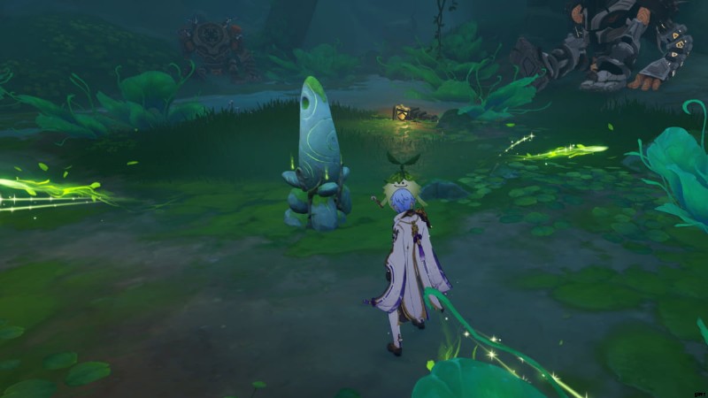 緑の痕跡 エリア内の三葉の像の場所に案内します。 鋭いポイントになるまで、それぞれの葉の像を回転させて操作するだけです 枝像の方を向いています 真ん中に。 3 つすべてが正しく回転すると、2 つの Ruin Grader が表示されます。それらを倒して会話を促し、ワールドクエストを完了してください。