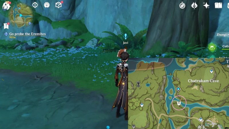 追加の報酬を受け取るには、Sumeru City Reputation Board のロックを解除する必要がある場合もあります。それらが完了したら、下の画像で丸で囲まれたエリアに向かい、木の下で何かを探しているハビを見つけます.