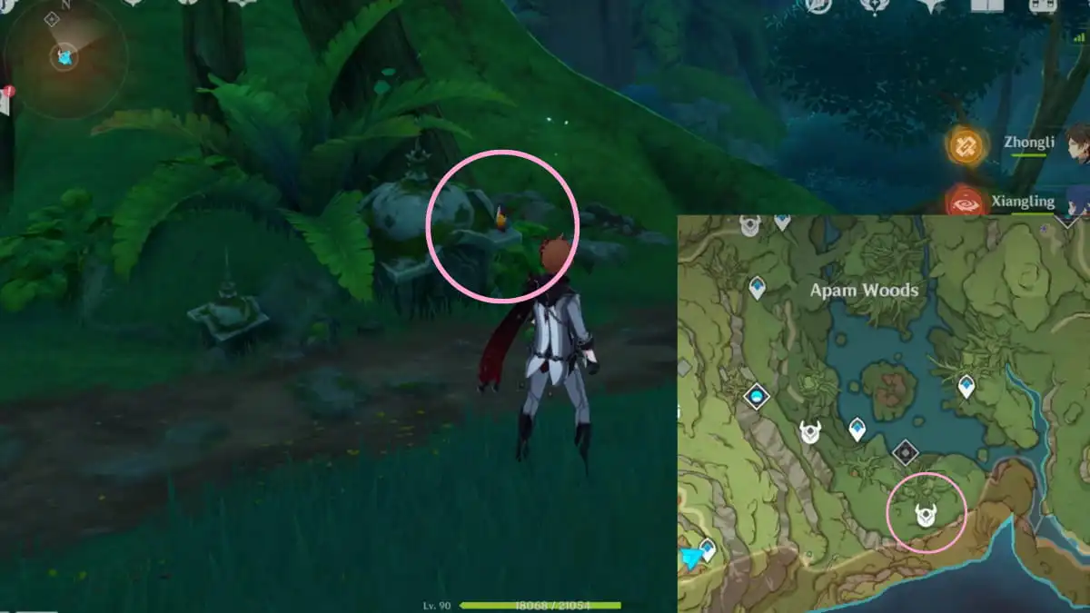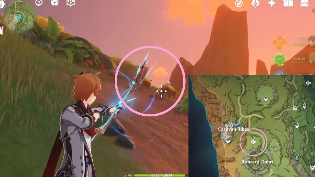 NPC は、Sumeru の野生生物を調査している研究者 Shefket として自己紹介します。彼は、彼のプロジェクトのためにドーン バードの羽のサンプルを探しているあなたの助けを必要としています。 アパムの森の南に向かう必要があります をクリックして最初のサンプルを見つけます。正確な場所は上の画像で丸で囲まれています。