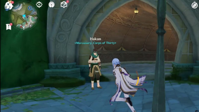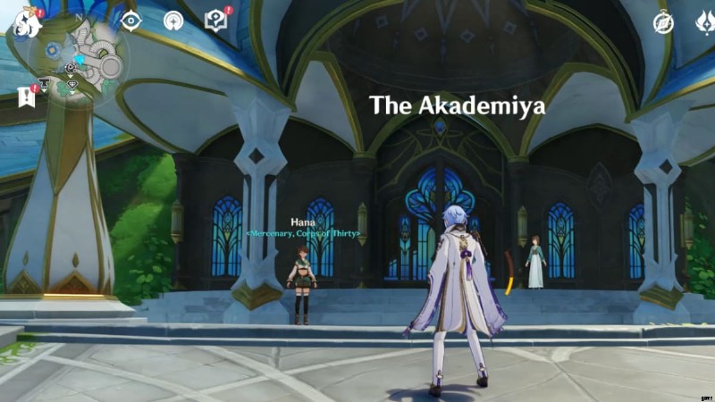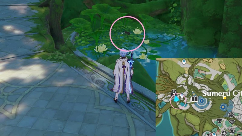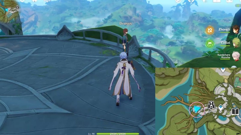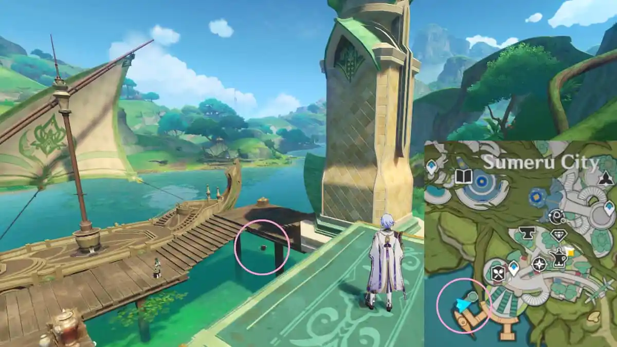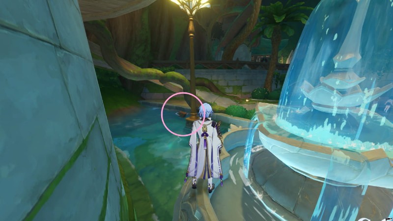 Sumeru City の最西端にある Surasthana の聖域 (上の画像の丸で囲まれた部分) に向かい、ゲーム内時間を 12:00 に変更します。 . Drusus という名前の NPC ベランダに出現します。彼と対話して、この隠された探索目標を完了してください。また、「I've Got it! I've Got it!」 という世界の驚異の実績もアンロックできます。 .