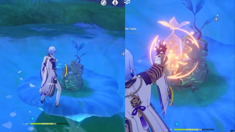 シーリーをたどって 2 番目のクエスト エリア (上の画像のミニマップにも表示されます) に進み、矢印に従ってこの水中アザラシに向かいます。 キノコに飛び乗る 水中アザラシで「クサバ」ガジェットを使用する 、エレメンタル スキル ボタンをクリックします。 オレンジ色のアラナラが見えるまで クリック攻撃 有効にするために。これにより、キノコのプラットフォームが成長し、シールが表示されます. 交流