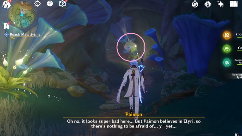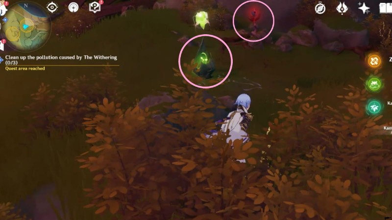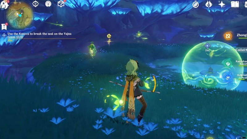 シーリーを追って最初のクエスト エリア (上の画像のミニマップにも表示) に向かい、「Kusava」ガジェットを シール に向けます。 、エレメンタル スキル ボタンをクリックします。 黄色いアラナラが見えるまで クリック攻撃 有効にするために。これで封印が修復されます—交流