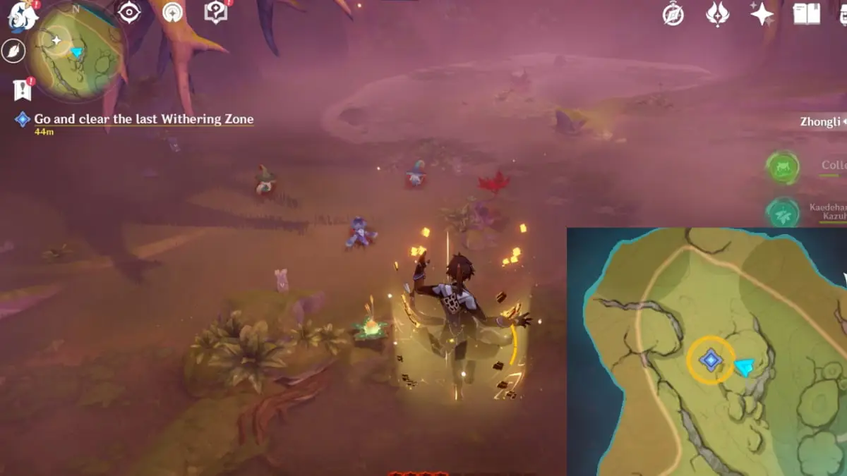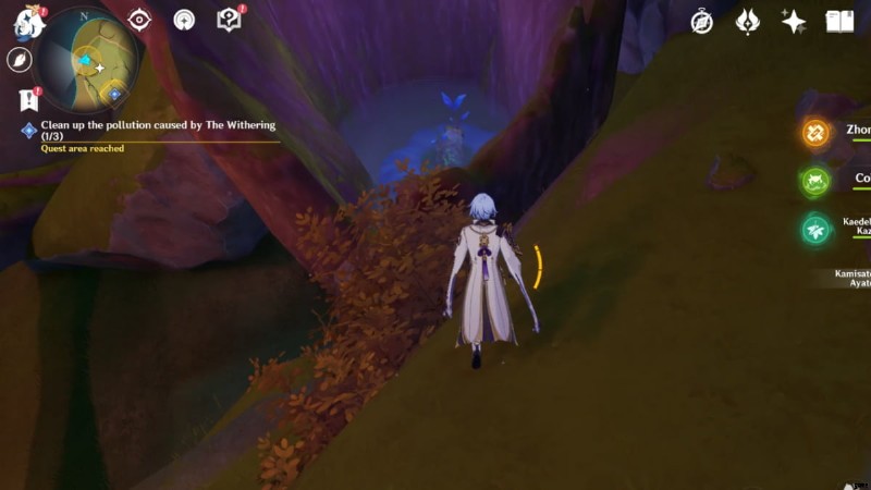 シーリーを追ってシーリー コートに向かい、精巧な宝箱の報酬を獲得します。次に、クエストマーカーをたどり、下のクリアリングにジャンプして、最後のウィザリングゾーンを見つけます. すべての敵を倒し、 次に交流 ウィザリングの腫瘍でクエストの目的を完了します。