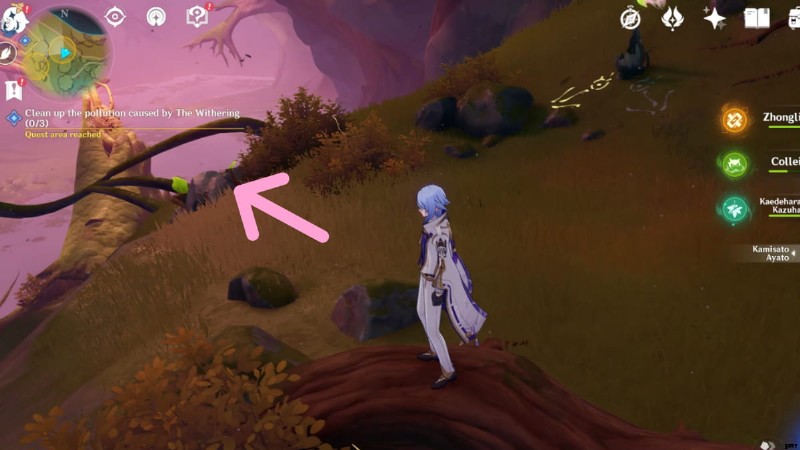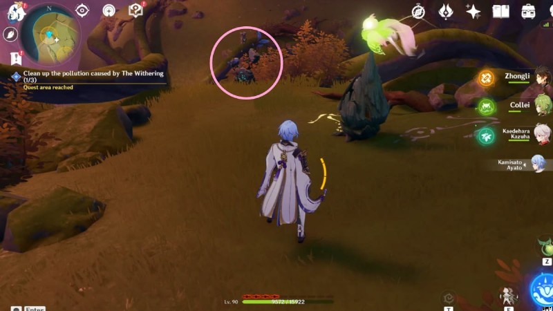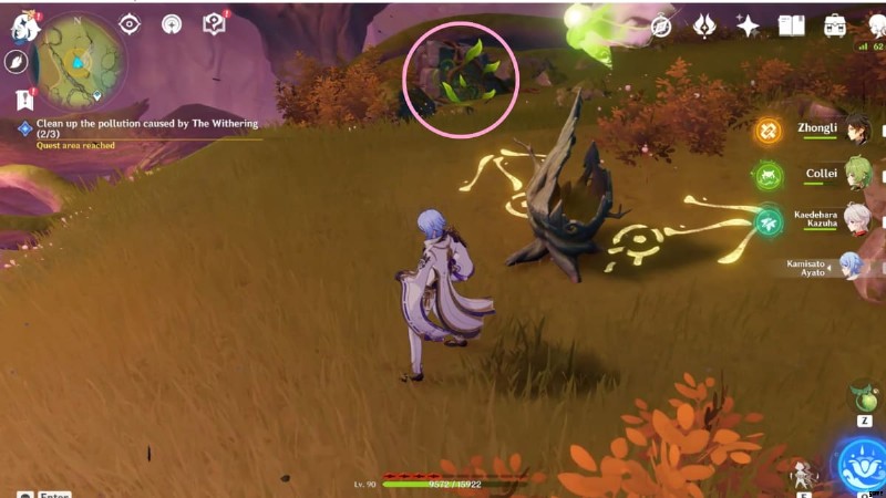 シーリーをたどって 3 番目のクエスト エリアに向かいます (上の画像のミニマップにも表示されています)。 つるのある岩で「クサバ」ガジェットを使う 、エレメンタル スキル ボタンをクリックします。 緑のアラナラが見えるまで クリック攻撃 有効にするために。これにより、岩が壊れて封印が明らかになります—対話