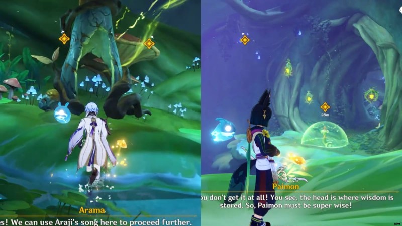 クエスト マーカーをたどって洞窟の奥にある巨大な木まで進み、光る調査スポットを操作してアラマとの対話を促します。少なくともデンドロ キャラクター 1 人を含む戦闘準備の整ったチームを準備してください。 弓の使い手 1 人 、次にダイアログ オプションを選択します (ヴァサラの木に手を伸ばして…) ドメインにテレポートされます。