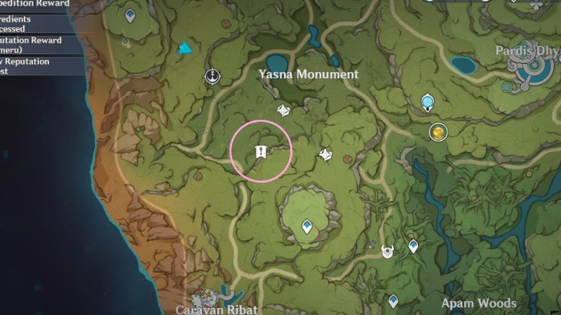 このワールド クエストのロックを解除するには、最初に 8 つのエレミテ キャンプすべてでエネルギー抽出デバイス チャレンジを順不同で完了する必要があります。それらが完了したら、Yasna Monument の Eremite キャンプに向かいます。その正確な場所は、下の画像で丸で囲んであります。