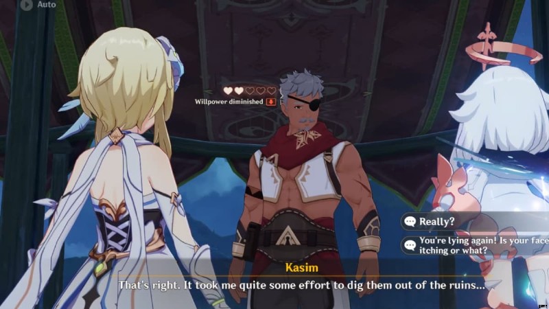 エレミテのキャンプに入ると、すぐに カットシーンがトリガーされます。 トラベラーとパイモンは、オレグという名前のファトゥイのメンバーとカシムという名前のエレミテの間の交換をスパイし、正式に愚かなファトゥース ワールド クエストを開始します。トリガーされない場合は、リログするか、8 つのキャンプすべてで Energy Extraction Device Challenge を完了したかどうかを確認してください。