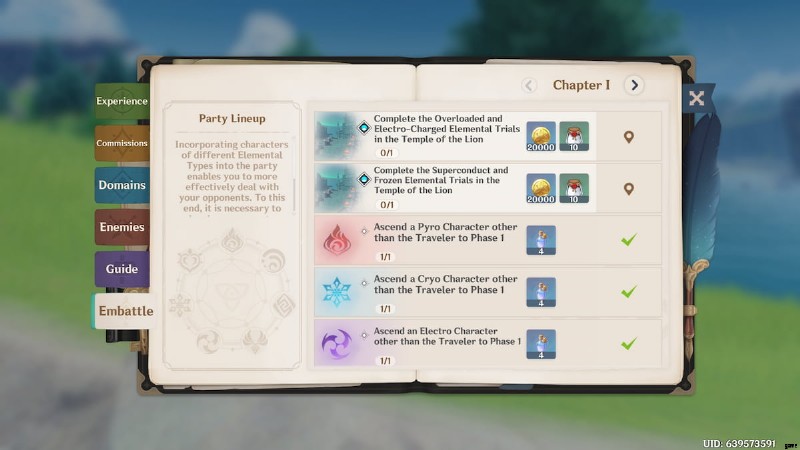 Genshin を初めて使用する場合は、Adventurer's Handbook の Elemental Trials を完了して、Dust of Azoth を無料で獲得できます。 .これらのエレメンタル トライアルはライオンの神殿で見つけることができ、気化、溶解、過負荷、超伝導、帯電、凍結、結晶化、渦巻きが含まれます。これらのエレメンタル トライアルを完了したら、Adventurer's Handbook を開き、Dust of Azoth の報酬を受け取ることができます。
