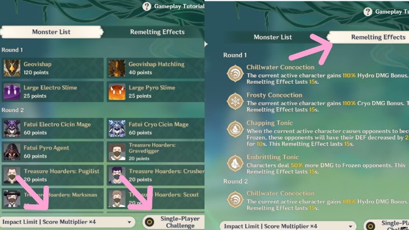 再溶解効果 に切り替えた場合 タブでは、戦闘中に再溶解装置を使用して取得できるすべてのバフを表示できます。画面の下部で、スコア乗数を選択できます (x1、x2、および x4)—乗数が高いほど、戦闘の難易度も高くなります。