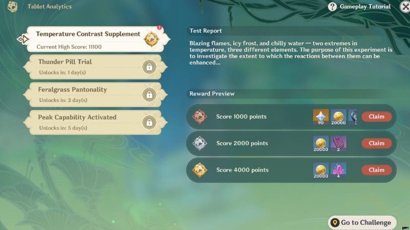 イベント メニューに移動し、タブレット アナリティクスを選択します。 イベントの詳細をクリックします 完了したステージの報酬を請求します。 Primogem を取得するには、ステージごとに 1,000 ポイントの累積スコアが必要であり、すべての報酬には 4,000 ポイントが必要です。