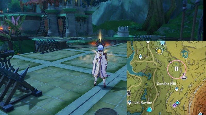 Sumeru City の東に位置する Gandha Hill には、コントロール キーを使用して拡散できる Energy Extraction Device を備えた Eremite キャンプがあります。下の画像を参照して、チャレンジの正確な場所を見つけてください。この地域には敵のエレミトが群がっているので、戦闘準備の整ったチームを必ず連れてきてください。