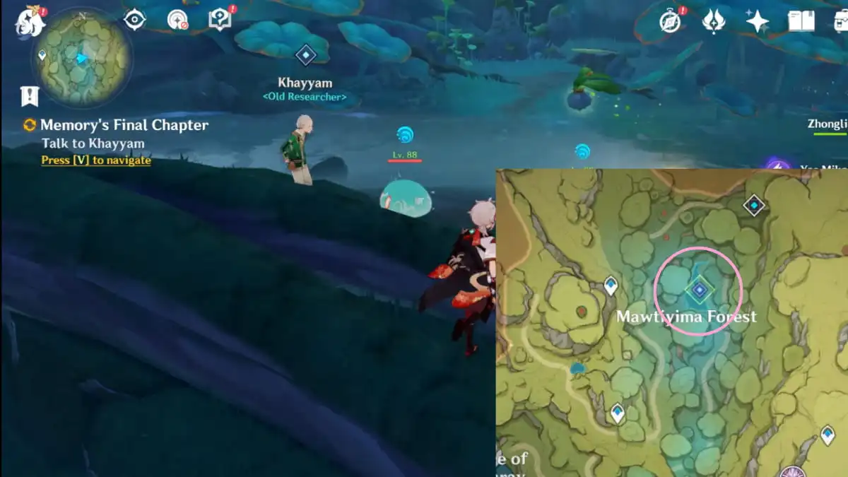 ゲーム内時間を 2 日早送り 、上の画像で丸で囲まれたエリアに向かい、キノコのフードの下にある別のキャンプの横にある Khayyam を見つけます。彼と話して、庭園のクルミの木と呼ばれる世界の驚異の実績を手に入れましょう 追加の Primogem 報酬。 Khayyam が表示されない場合は、Memory の最終章を完了していることを確認し、日中であることも確認してください。