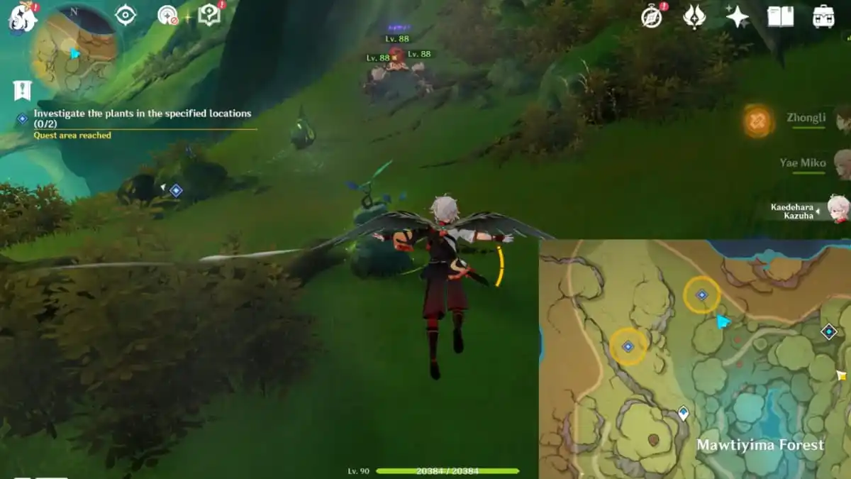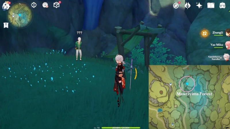 マウティーマの森の西にあるテレポートウェイポイントから滑空して、上の画像で丸で囲んだエリアに向かいます。 ???という名前の老人がいるキャンプを見つけるでしょう。彼と話して、彼があなたの助けを必要としている Amurta Dastur の Khayyam という名前であることを知りましょう。彼に話しかけた後、クエスト マーカーに従って地下の洞窟に向かいます マウティーマの森にて。 Khayyam に近づき、2 か所の植物を調査するよう求められます。
