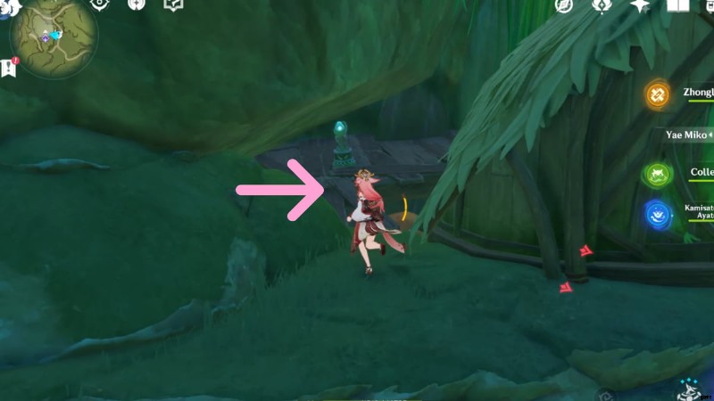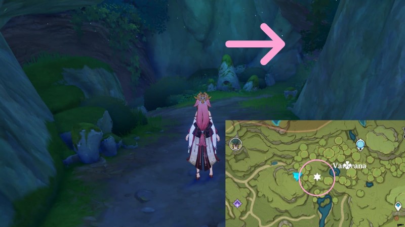 前提条件を完了したら、本物のヴァナラナに切り替えて、アラナクラの庭に戻ります。上の画像の丸で囲んだところに洞窟があるので、交差点を右折するとたどり着きます。中に入ると、パイモンは甘い花がたくさんあると叫びます。