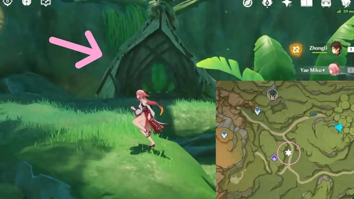 次に、上の画像で丸で囲まれたエリアに向かい、エレミテ キャンプを見つけます。 .上の画像に描かれている小さな家に注目してください。 背後 隠れた洞窟に通じる小さな入り口です。