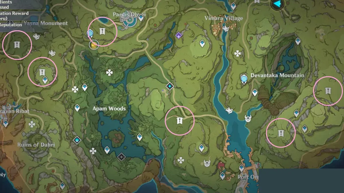 上の画像を参照して、Sumeru の南半分にある 6 つの Vasmrtis を見つけてください。