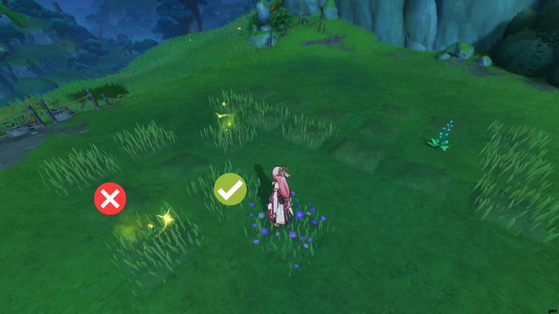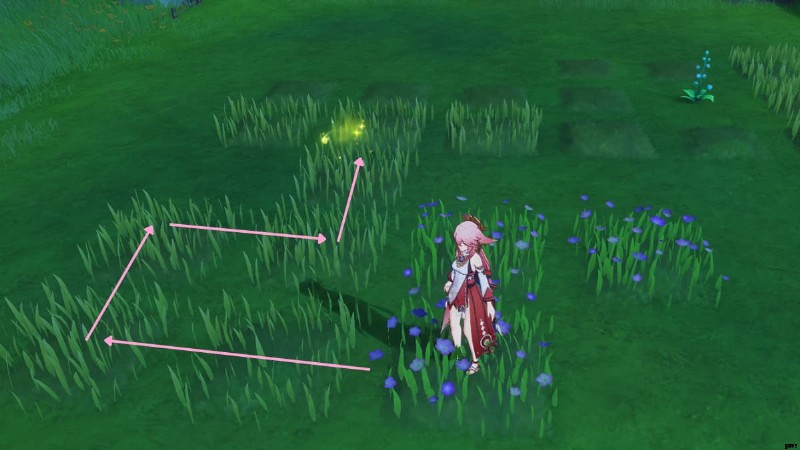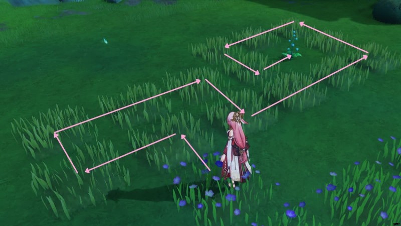 上記の場所に向かうと、光る草のパッチに遭遇します。 踏んでください 草のいくつかのパッチが表示されるように促します。あなたの目標は、最後に花に到達するまで草が茂った道をたどることです。ただし、従う必要のあるルールがいくつかあります:
