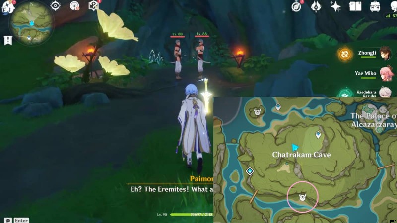 上の画像で丸で囲まれたエリアに向かうと、Chatrakam Cave の中に入る入口があります。 2 体のエレミト を見つけることができます 入り口すぐ。彼らはあなたが洞窟に入るのを止めませんが、彼らを倒す必要があります このワールドクエストの目的の一部として。