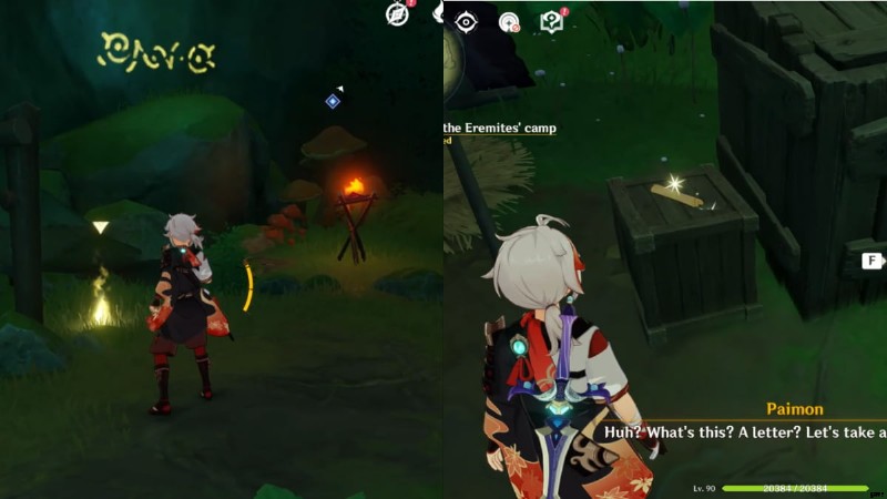 3 つすべてのエレミテ キャンプの場所は、ミニマップとワールド マップで強調表示されます。 、クエストナビゲーターを使用してそれらを見つけることができます。それらはすべて洞窟内にあるため、テレポート ウェイポイントを使用してアクセスしないでください。北と西のキャンプは、輝く調査スポットで迎えてくれます 東キャンプにはEmployer's Ordersと呼ばれる羊皮紙が含まれていますが、対話する必要があります 、目的を完了するためにも対話する必要があります。