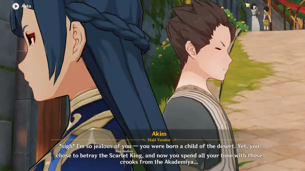 2 番目のターゲットは、Akim という名のストール ベンダーです。クエスト マーカーに沿って光るスポットまで進み、Nahida に憑依するように促します。次に、すべてのダイアログ オプションから次の回答を選択します。