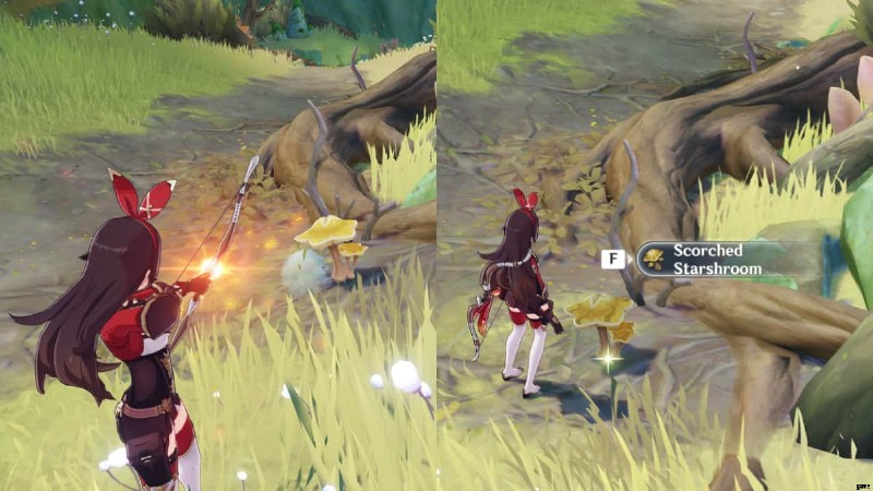 パイロを適用するには、任意のパイロ キャラクターを使用してください スターシュルームに乗り込み、焦げたスターシュルームに変えます . Scorched Starshroom は、しわが寄ったように見えます。これが、素材を収集する Aranara が探しているものです。