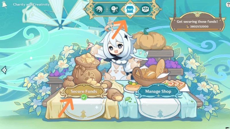 イベント メニューの [バラードとビール] セクションに移動し、[イベントの詳細] を選択します。 をクリックし、3 番目のタブに切り替えて慈善と創造性を見つけます。マネージ ショップは最初はロックされているため、[資金を確保] をクリックして NPC との物々交換を開始します。目標は 32,000 モーラ にすることです。 .
