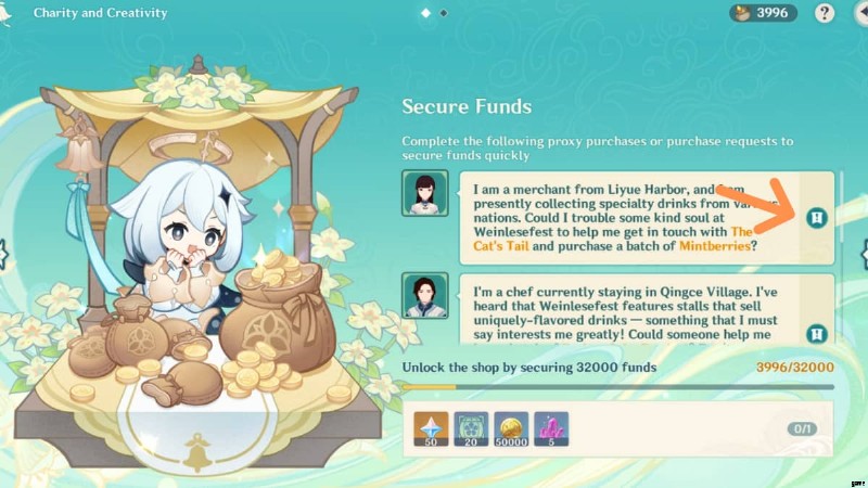 商人のゲオルグとダイアナは、屋台の材料を購入しています。 各材料を 1 日 5 個まで販売できます .したがって、前のクエストでモーラを使いすぎた場合は、サーバーがリセットされるまで待って、さらに多くの材料を販売し、ショップの管理アクティビティのロックを解除するために必要な 32,000 モーラを確保できます。 32,000 Mora を確保したら、資金確保ページの下部で報酬を請求することを忘れないでください .