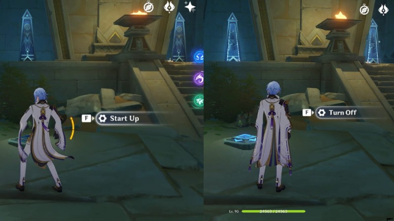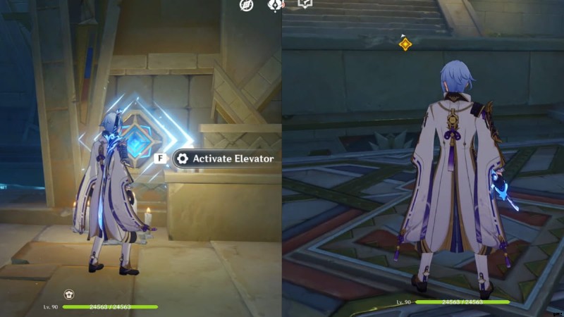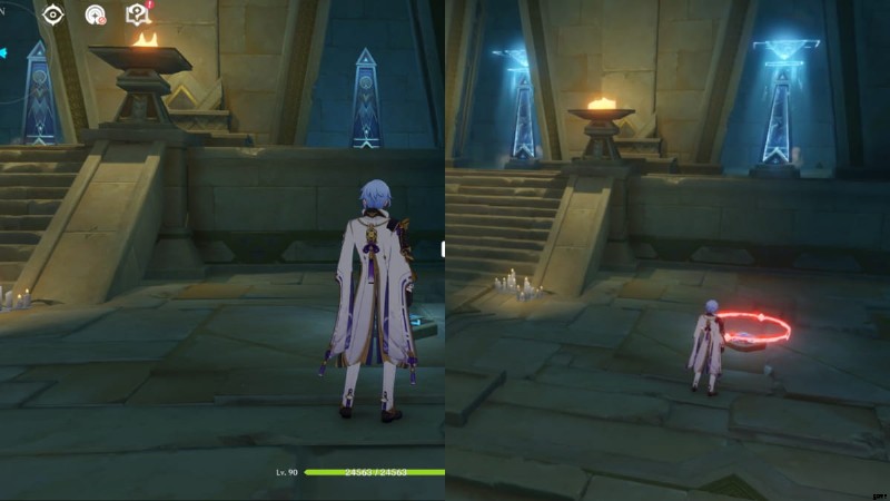 ドメインに入ったら、左に曲がります 3つの柱を見つけます。 ローテーションする必要があります 上の参照画像の図が表示されるまで、それぞれを任意の順序で実行します。柱も青く光る 正しく回転していることを示します。終わったら、エレベーター 部屋の中央に出現します。エレベーターに乗って操作 、それをアクティブにして、あなたを下の階に連れて行きます。