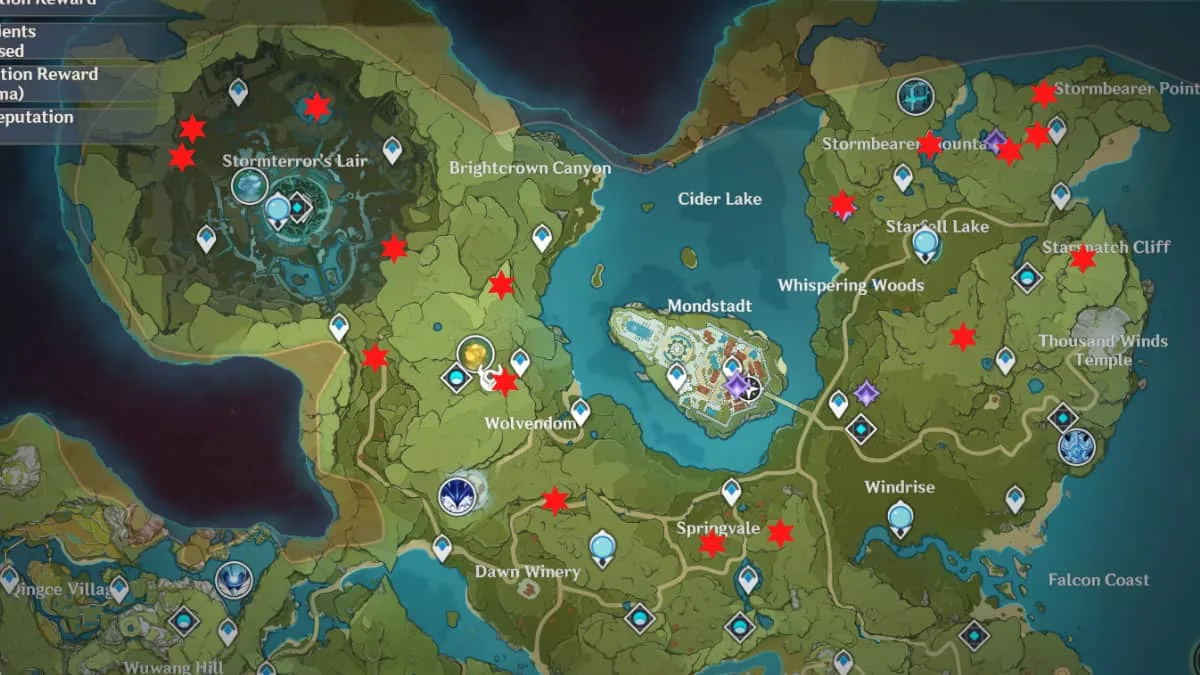 モンドシュタットのタイム トライアルの 5/10/15 を完了すると、風を追う冒険者を獲得できます。 成果。 17 のタイム トライアルの場所を見つけるには、下の画像を参照してください 赤い星でマークされているモンドシュタットにあります。